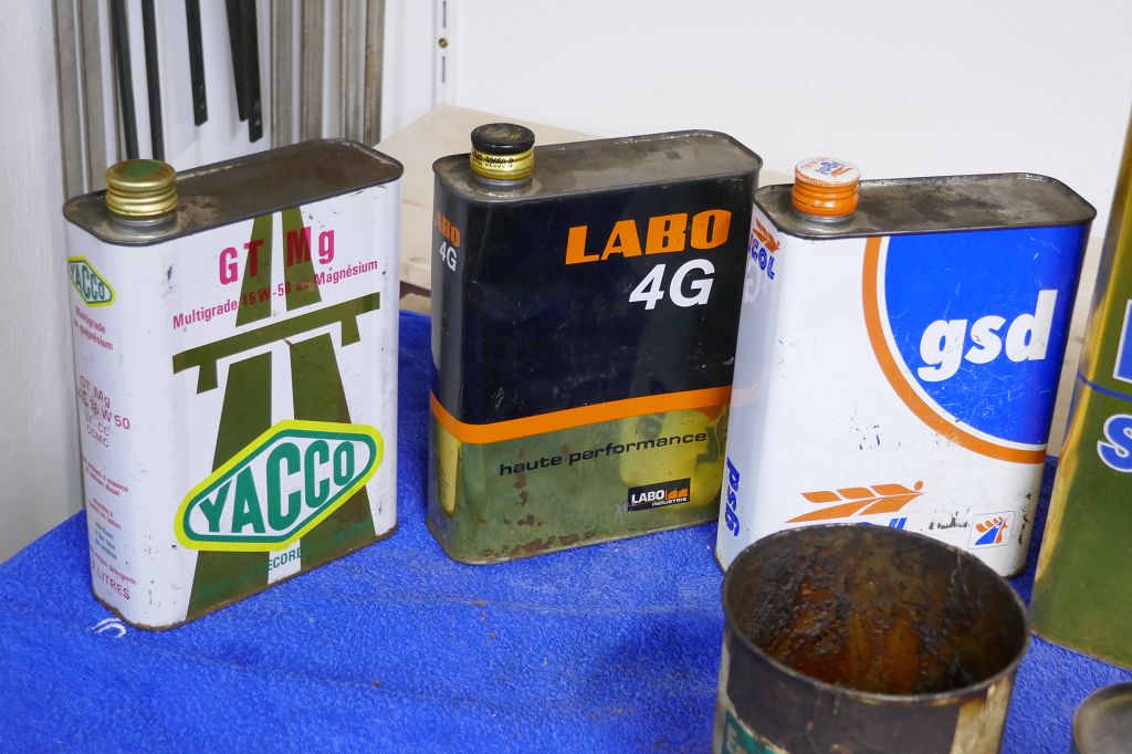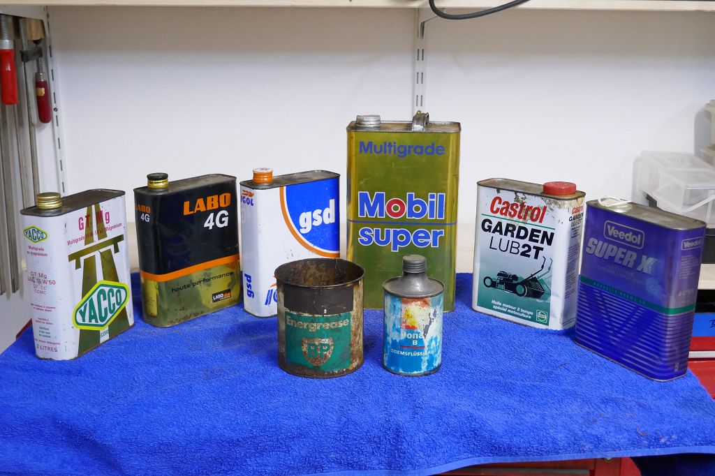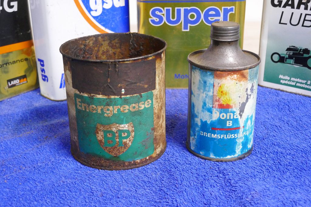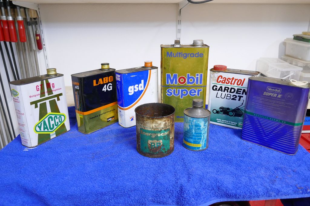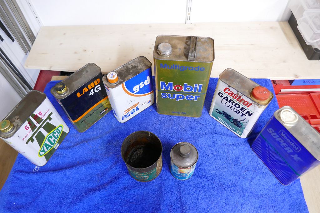 8 Stk alte Öldosen Shell Mobiloil Castrol Veedol Yacco Labo usw… Sammler