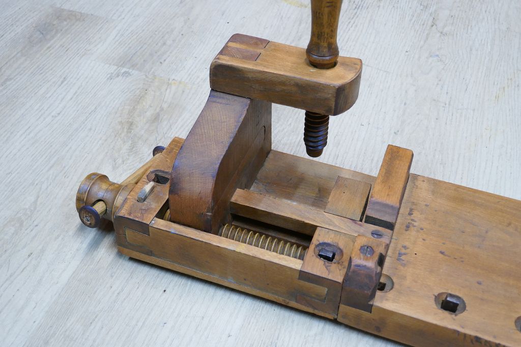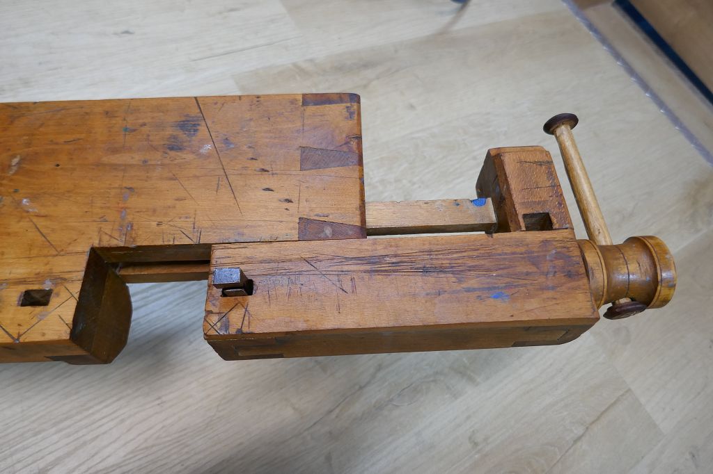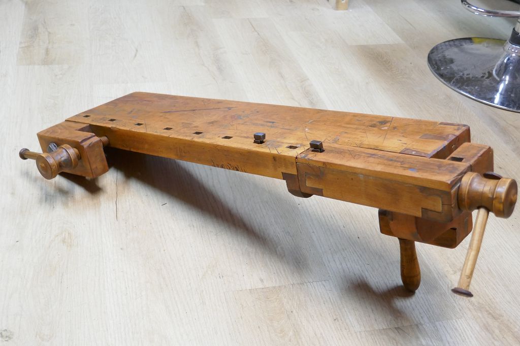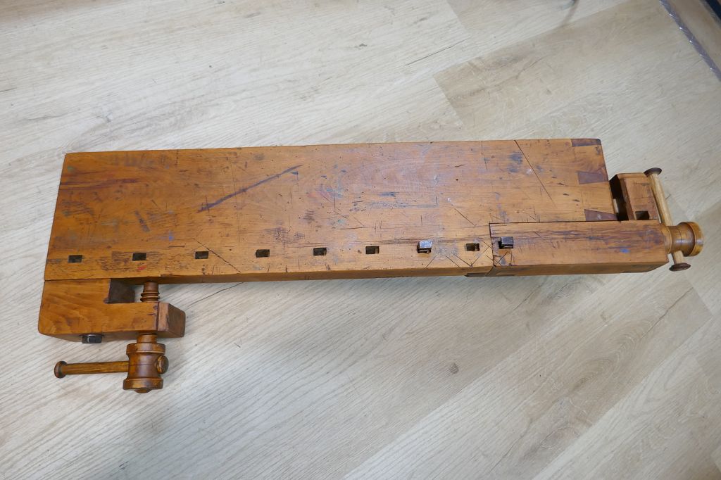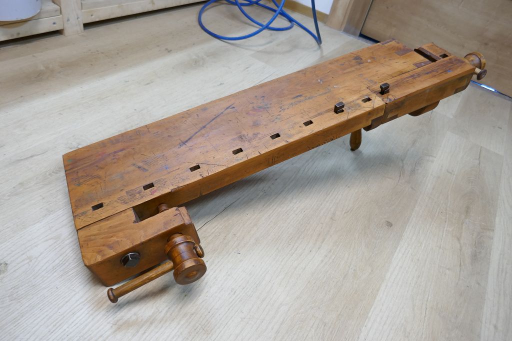 Wurde restauriert / aufbereitet, beide Spindel sind voll Funktionsfähig, diese Hobelbankplatte kann einfach auf einer anderen Arbeitsplatte fixiert mit der Feststellschraube von unten, dabei sind noch die originalen Bankhaken, das letzte Foto dient als Größenvergleich mit einer gewöhnlichen Hobelbank, weitere Details siehe Fotos !