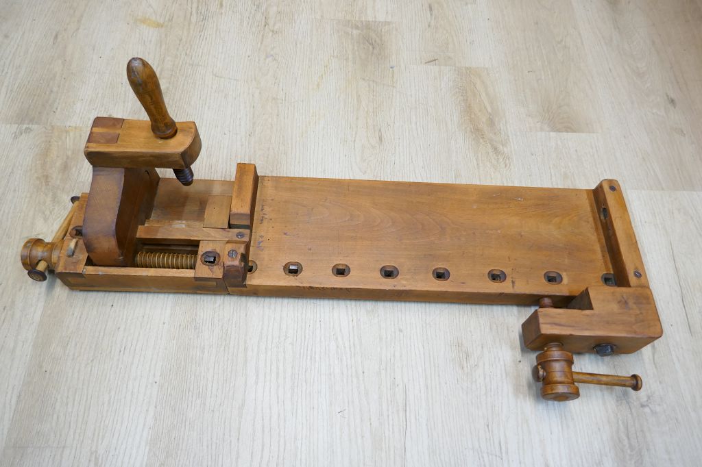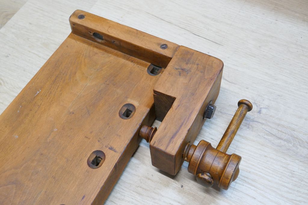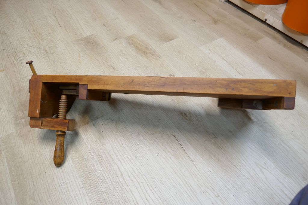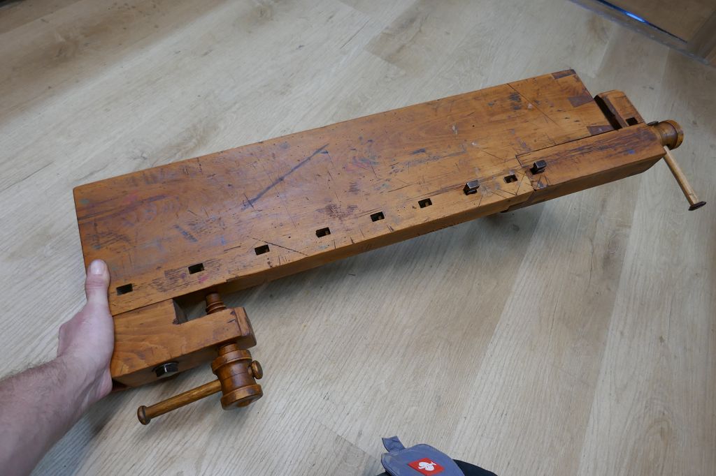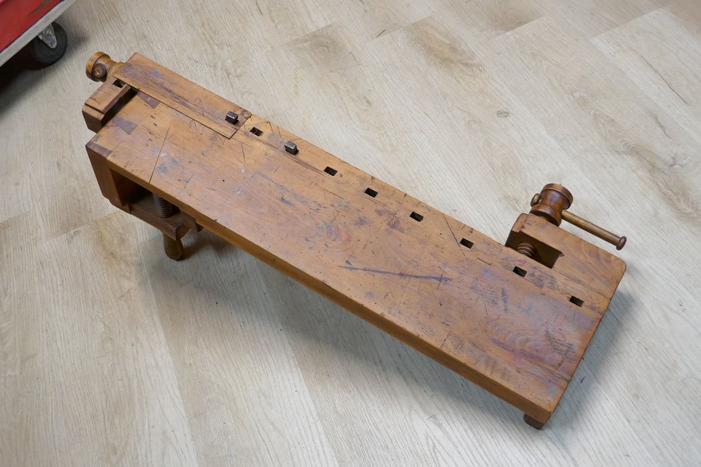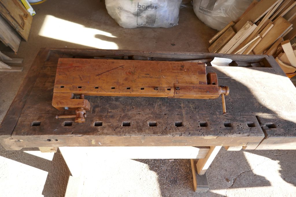 Wurde restauriert / aufbereitet, beide Spindel sind voll Funktionsfähig, diese Hobelbankplatte kann einfach auf einer anderen Arbeitsplatte fixiert mit der Feststellschraube von unten, dabei sind noch die originalen Bankhaken, das letzte Foto dient als Größenvergleich mit einer gewöhnlichen Hobelbank, weitere Details siehe Fotos !